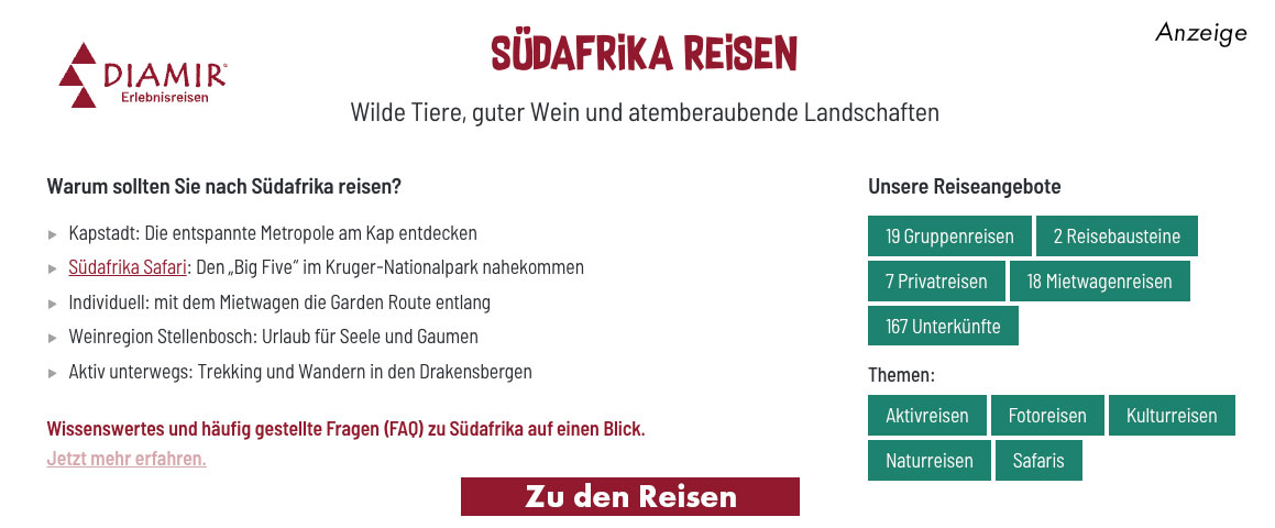 Bist du bei der Planung überfordert? Dann kann ich dir den Reiseveranstalter DIAMIR sehr empfehlen. Sie beraten dich hervorragend, denn sie sind Südafrika Kenner. Keine 0815-Routen wie so manch andere Reiseveranstalter (die bei Google vorn stehen), sondern auf dich und dein Budget zugeschnittene Routen: