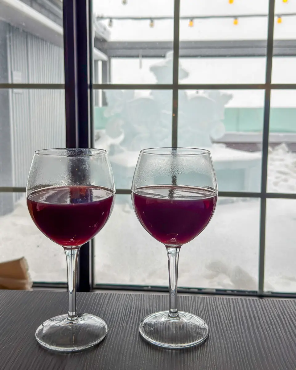 Wir hatten einen VIP-Tagespass (100 $, gültig von 12 bis 18 Uhr an einem Tag). Dieser beinhaltet exklusiven Zugang zu den beheizten und möblierten Domes; eine private VIP-Bar mit Eiswein, Wein, Cocktails und alkoholfreien Cocktails; eine Premium-Verkostung von drei Eisweinen; und eine (Wurst-) und Käseplatte. Die VIP-Sitzplätze werden nach dem Prinzip „Wer zuerst kommt, mahlt zuerst“ vergeben.
