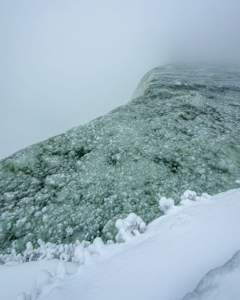 Wir sind hier immer wieder zurückgekommen, um das Schauspiel zu unterschiedlichen Tageszeiten und Stimmungen zu beobachten. Während des Wintersturms haben sich die Eisformationen im Fluß stündlich geändert und die Eisbrocken, die hinabstürzten, wurden immer größer.