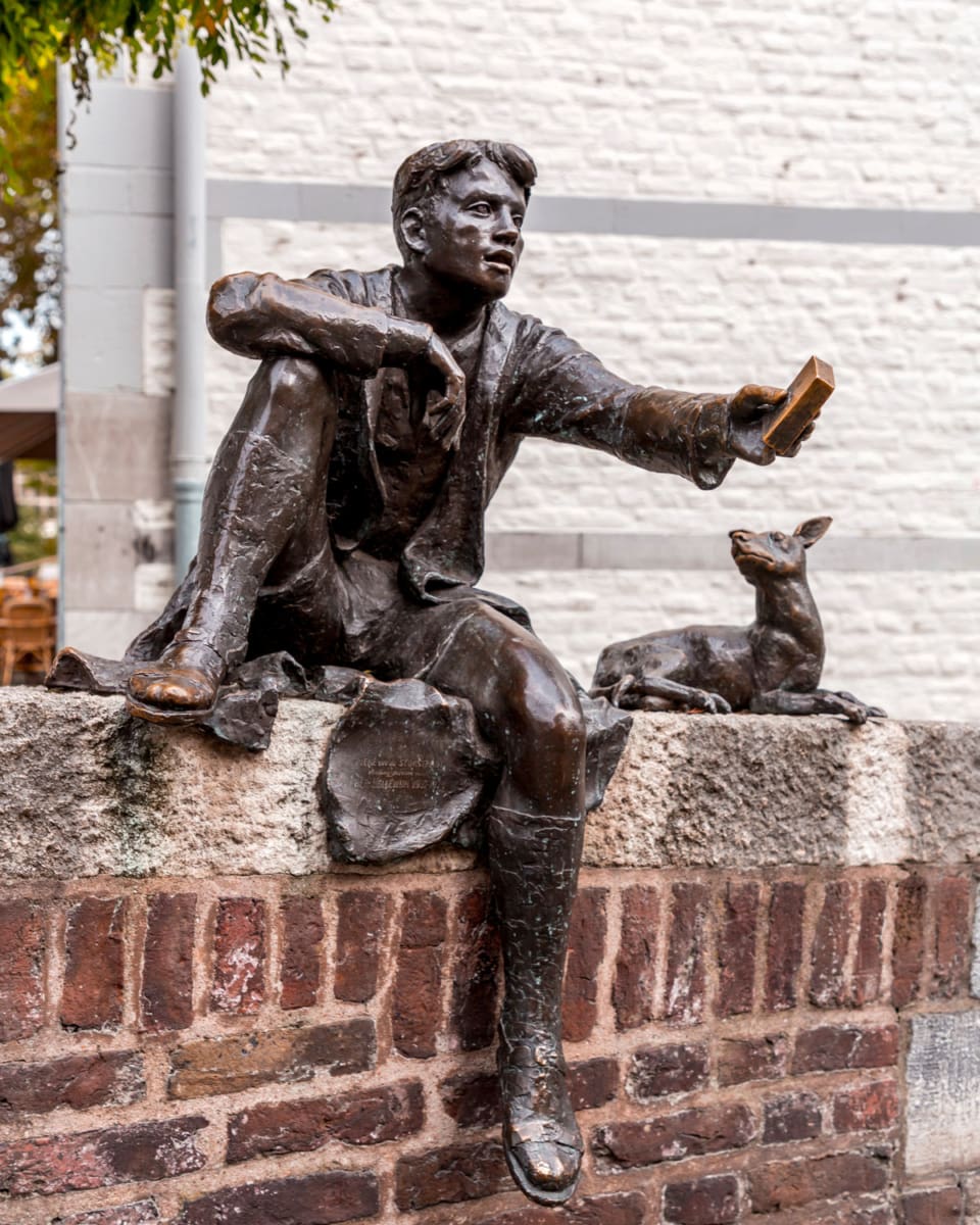 Wenn du danach durch die kleinen Gassen der Altstadt schlenderst, kommst du an der Stokstraat vorbei – eine der ältesten Straßen Maastrichts mit hübschen Boutiquen und Kopfsteinpflaster. Hier findest du auch die kleine Bronzestatue „Pieke oet de Stokstraat“, die einen Jungen mit Laterne zeigt. Sie ist kein Muss, aber ein schönes, charmantes Detail der Stadtgeschichte – und ein beliebter Fotospot bei einem Bummel durch die Altstadt.