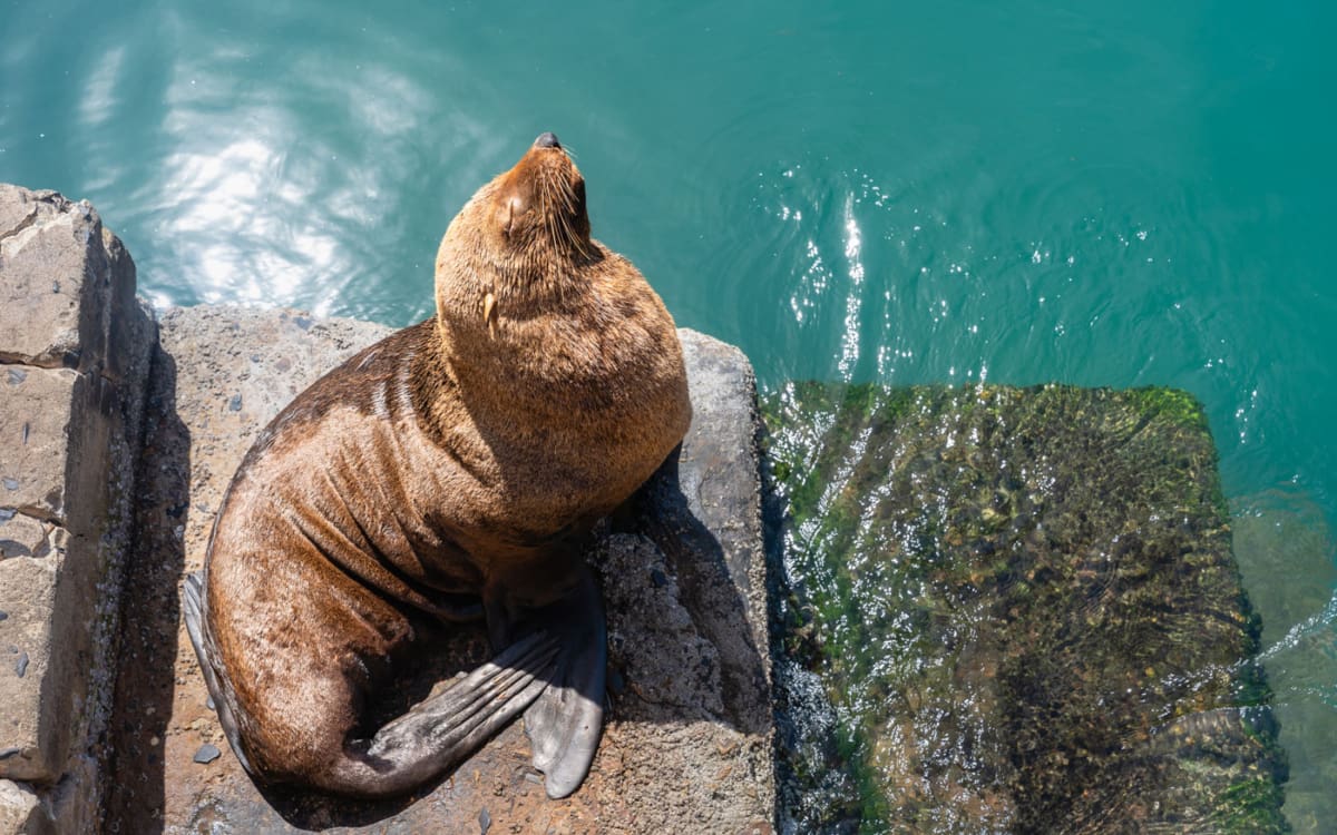 Bei ruhigem Wetter kannst du entspannt über den Pier schlendern. Fast immer liegen Seelöwen auf den Steinen oder dümpeln im Hafenbecken. Sie sind an Menschen gewöhnt und lassen sich gern beobachten, sind aber wilde Tier – bitte Abstand halten.