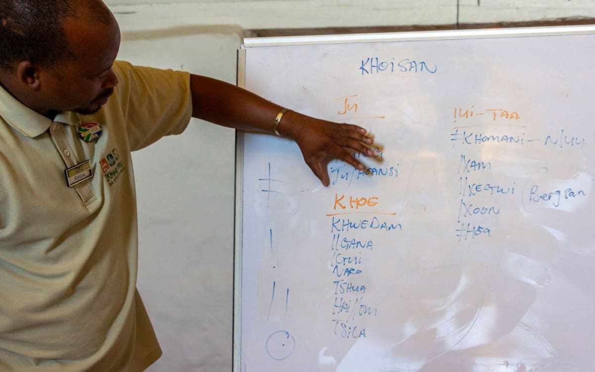 Das Zentrum wurde gegründet, um das Wissen, die Sprache und die Traditionen der San (auch Buschmänner genannt) zu bewahren und weiterzugeben. Während der geführten Touren – die von San selbst geleitet werden – erfährst du mehr über ihre Lebensweise, traditionelle Jagdmethoden, Heilpflanzen und die berühmten Klicklaute ihrer Sprache. Es ist beeindruckend zu hören, wie komplex diese Sprache aufgebaut ist, und wie sie über ganz eigene Symbole und Laute funktioniert. Wer möchte, kann sich sogar selbst daran versuchen, ein echtes Zungenbrecher-Erlebnis. Ich habs nicht hingebracht.