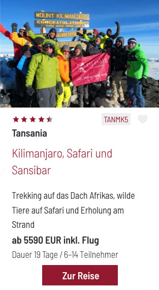 Nicht zu vergessen im Nordosten Tansanias: der höchste Berg Afrikas, Kilimandscharo (5.895 m) und UNESCO-Welterbe, der nicht nur Abenteurer aus der ganzen Welt anzieht.