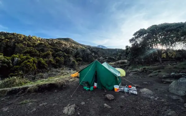 Nach einer erholsamen Nacht klingelte der menschliche Wecker namens „Isaac“ erneut um 6:30 Uhr mit Kaffee und Tee an unserer Zelttür. An diesem Morgen war die Luft derart klar, dass sowohl Mt. Meru als auch der mit jedem Tag näher kommende Kili-Koloss in vollem morgendlichem Sonnenglanz erstrahlen konnten.