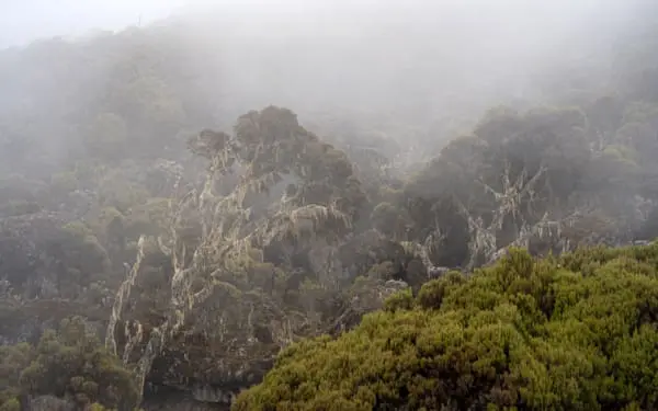 Um 8:30 Uhr wandern wir los. Fünf Stunden geht es heute stetig aufwärts: Es wird immer steiler, als sich die Umgebung nach und nach zu einer magisch anmutenden, wunderschönen Wald-, Steppen- und Moorlandschaft verwandelt. Bedrohlich im Nebel und Wind wehende Bäume mit spanischem Moos, hier „grandfather’s beard” genannt, schaffen eine mystische Stimmung am Berg.