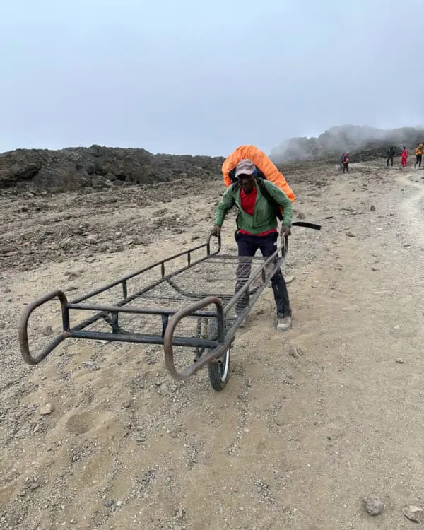 Mehr noch: Diesmal kam uns sogar ein kräftiger Mann entgegen, der ein „Kilimandscharo Taxi“ auf dem Kopf nach oben trug. Dieses Einrad-Liege-Gefährt diente dem Transport etwaiger Verletzter in Richtung Stadt, denn der Helikopter kann bei Notfällen nicht immer fliegen. Ob man sich aber diese "African Massage" auf dem unebenen Terrain antun will, ist fraglich ...