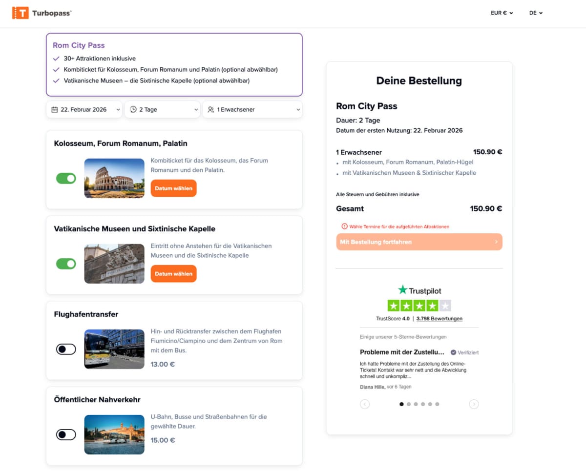 - Gehe direkt auf die Webseite von Turbopass zum Kauf des Rom City Pass.